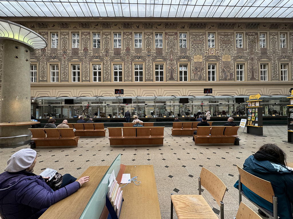 I just liked the way the Prague main post office was set up – you walked in, used a touch pad to describe what sort of business you needed to conduct and a queue ticket with a number popped out. Then you sat calmly on a fairly comfortable bench waiting for your number to come up; it was so easy and relaxed. Maybe I’ll send postcards out; maybe I’ll keep the postcards. I don’t know.