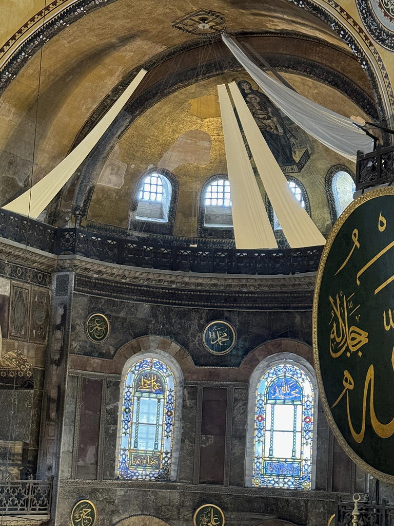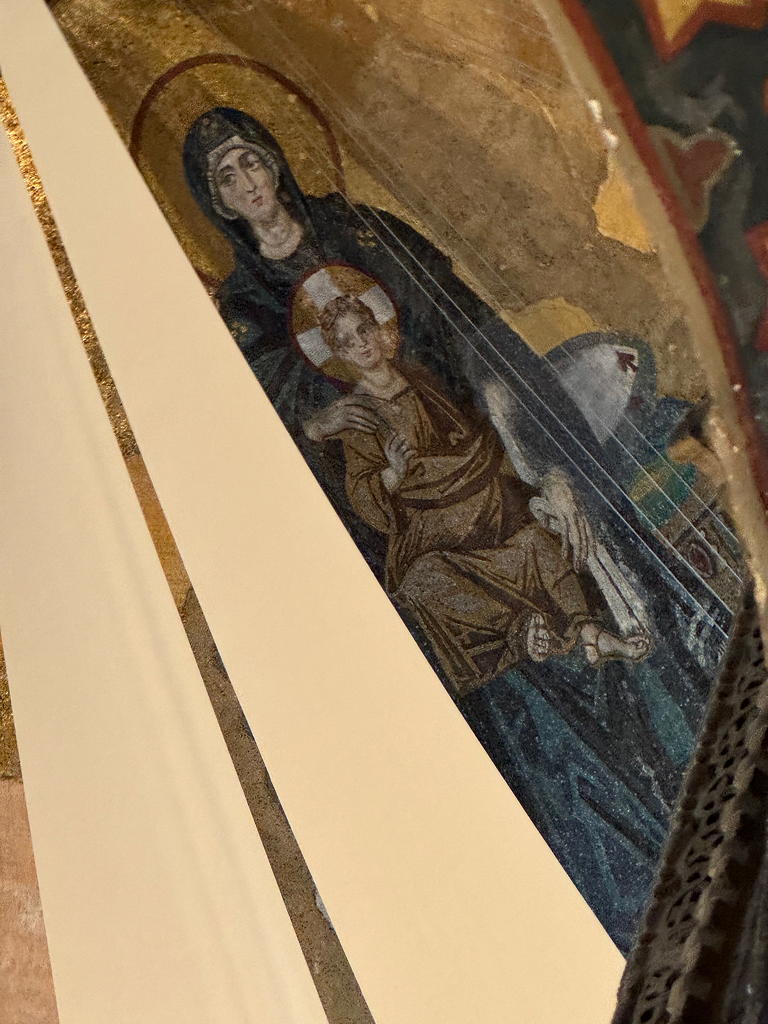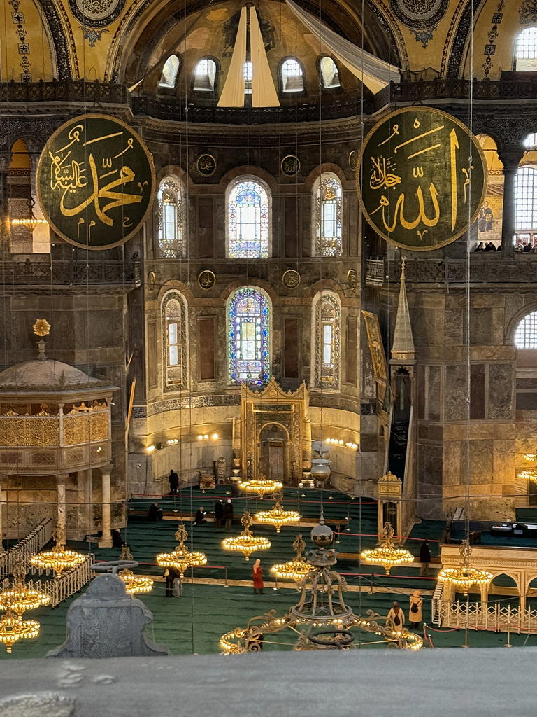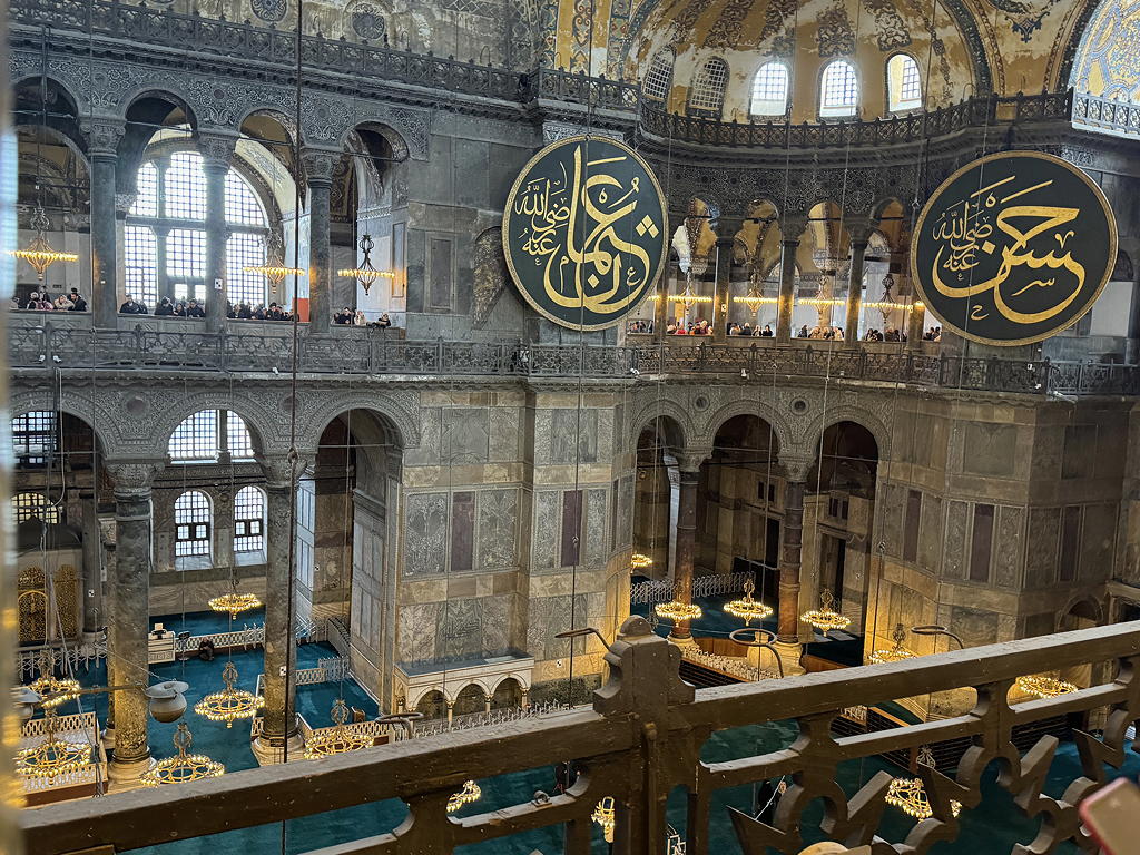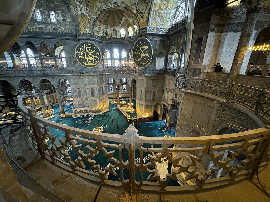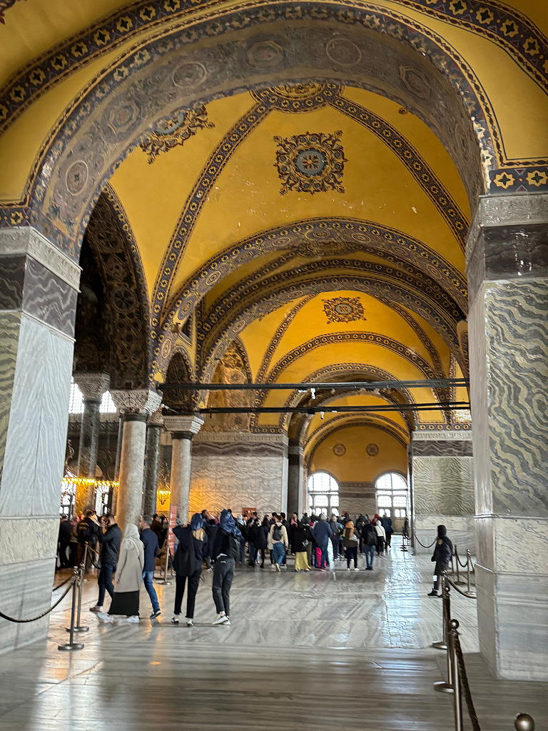 My knee was still holding out so we went to the Hagia Sofia. The building began as an Eastern Orthodox church, then a Catholic church then a mosque, then a museum and, in 2020, a mosque again. It is now a church museum on the second floor and a mosque on the first floor. The climb up to the second floor along ramps (so much easier than stairs!) which really challenged my knee. It was very much worth the trip. One bit of note: Since human images are not allowed to be seen in a mosque, the paintings and tile work of the church, depicting the Madonna and Child or Saints are screened from the mosque worshipers below but not defaced or destroyed.