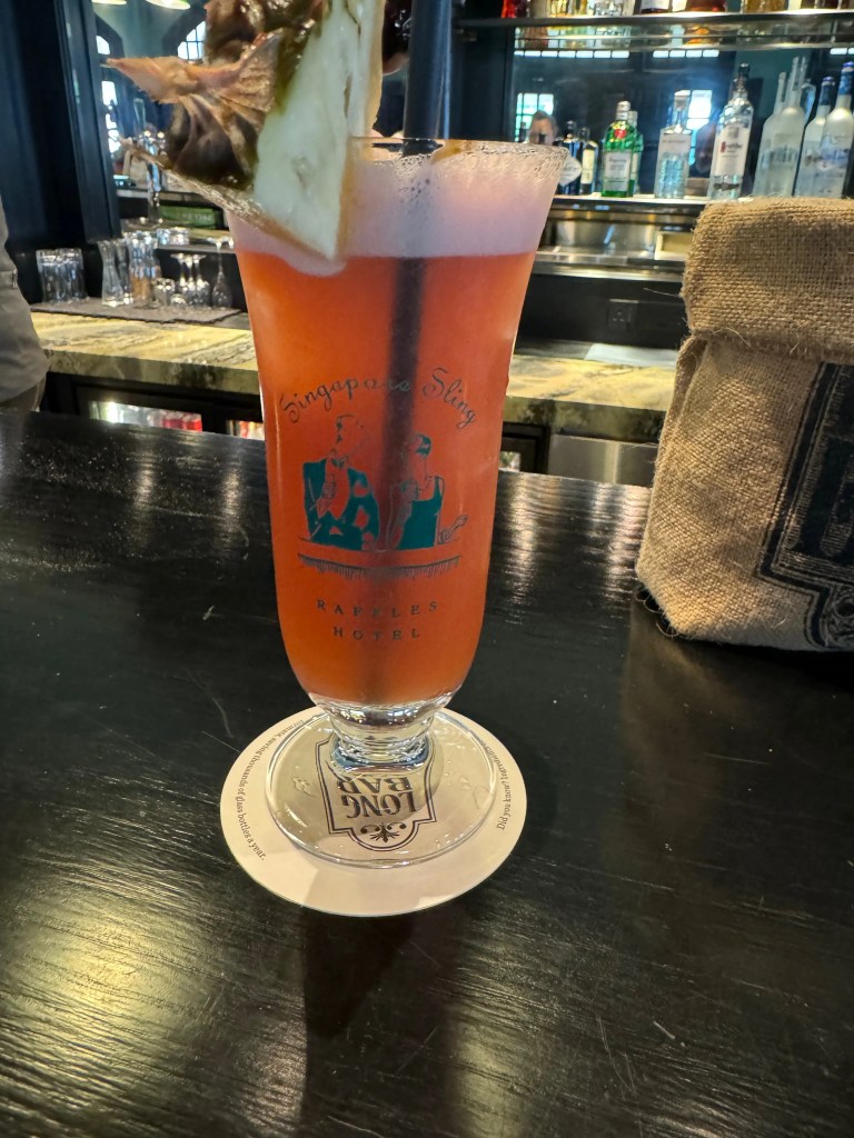 I caught the next tour bus and stayed in air conditioning until stop #18, Raffles Hotel, where I planned to do the other Singapore thing on my list – drink a Singapore Sling at the Long Bar where the drink originated (https://www.rafflessingapore.com/the-raffles-stories/history-of-the-singapore-sling/). My Go pass entitled me to a free drink in the Long Bar; I was seated at the upstairs bar. The woman on the left of me started a conversation about the Singapore Slings we were drinking. She was from a town in Queensland, Australia, on a spontaneous holiday. Melissa was her name, I think. We chatted for a while; she told me that even the Singaporeans thought that the weather was unusually hot! That made me feel a tiny bit better while in the air conditioned bar. I told her about my RTW trip which triggered the man on my right chiming in on the conversation about Australia and drinks. Edward, also Australian, was from Adelaide. Somehow I ended up talking to Edward more – he was very social and from a spot I’ll visit later on this trip. I picked up some winery and sightseeing tips from Edward and I ordered a second Sling. Melissa said I’d enjoy Queensland – just as sunny but less humid – I have no doubts about the weather, just about if I’d enjoy it … Cairns can be very sultry, as I recall. Melissa left first; she said she’d been there a while and had had a number of cocktails at that point. Edward left to pack and catch a plane home a short while afterwards. I settled my tab and went downstairs where I got some food plus a Negroni and a Sidecar. It was not a cheap day since Singapore has a high tax on alcohol. It was worth the expense, I’d been wanting decent cocktails for nearly a week and a half!