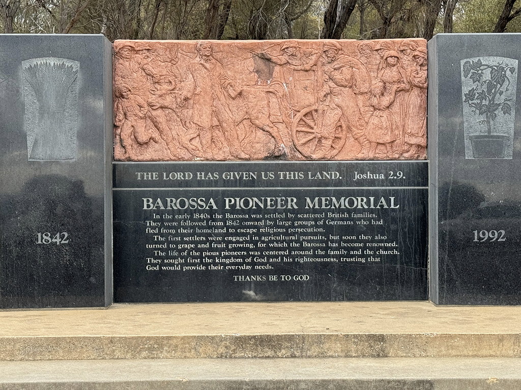 There was a REALLY delicious lunch and wine tasting at Saltram Winery, then a visit to the Menglers Hill lookout and the Barossa Pioneer Memorial for a view of the valley where we’d just toured.
