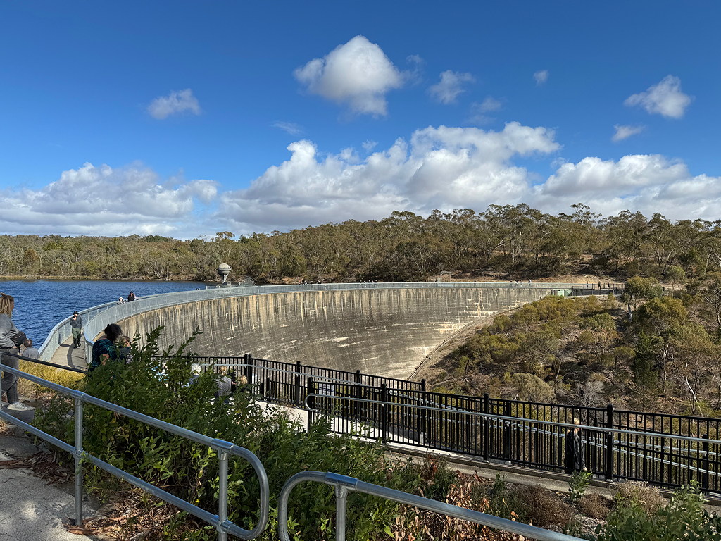 I had scheduled a tour of the Barossa Valley wineries back in October of 2023, but I did not anticipate how tired and achy I’d be. I’d slept well in a quiet hotel room and woke early to take NSAIDs. The breakfast buffet was now included with my room; it was delicious. There was a little confusion about where I needed to pick up the tour bus, but texting and emails settled on the pick up point. We took a scenic route through the beautiful Adelaide Hills with Robert, our driver, commenting on the history of Adelaide and wine culture. Unlike Sydney, Adelaide was established as a colony of free immigrants, promising civil liberties and freedom from religious persecution. It has the nickname of The City of Churches and many faiths were welcomed during its founding. No convicts were involved in the settlement of Adelaide for many years. Our tour stoped first at the Whispering Wall, part of the Barossa Dam. The design of the wall means that you can hear people whispering over 450 ft away. It was a pretty spot and vital to the water usage of both Adelaide and the wineries in the area who use a fair amount of irrigation to grow grapes.